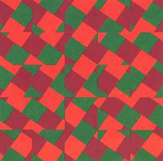 experienced by the eyes, the other one by the ears. Presented as a room installation, 'A magic square of 5 to look at' is a floorpiece of 5 x 5 m, and 'A magic square of 5 to listen to' can be heard through a quadraphonic sound system, performing the four staffs of the score independently, starting about 5 seconds after each other. The audience moves around the floorpiece in the space. The sounds are recorded on computer using
